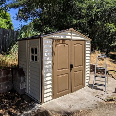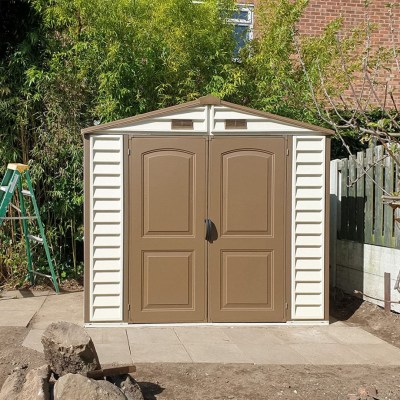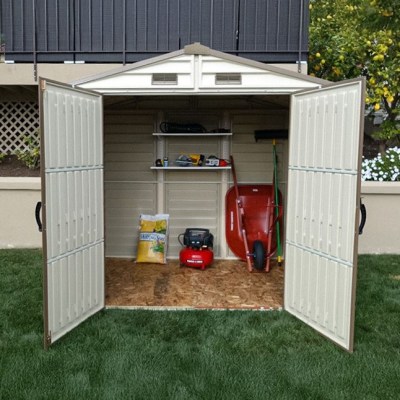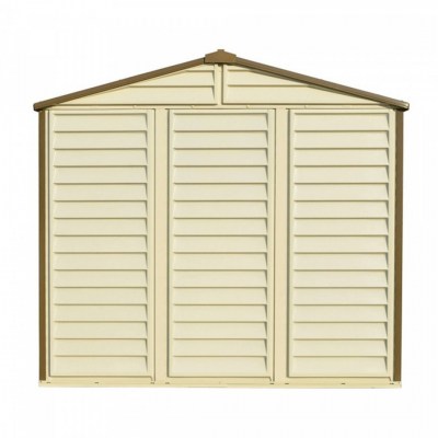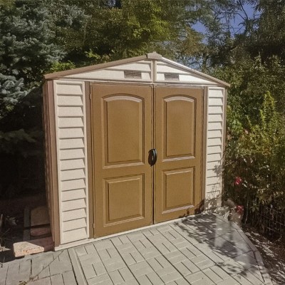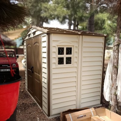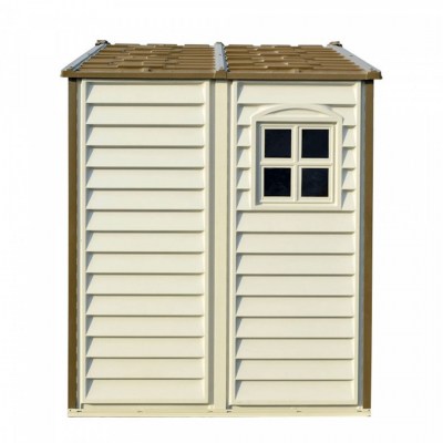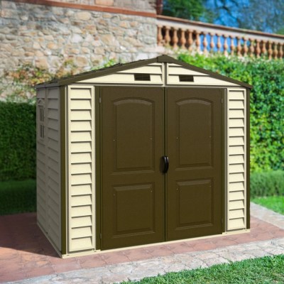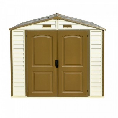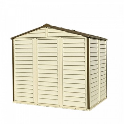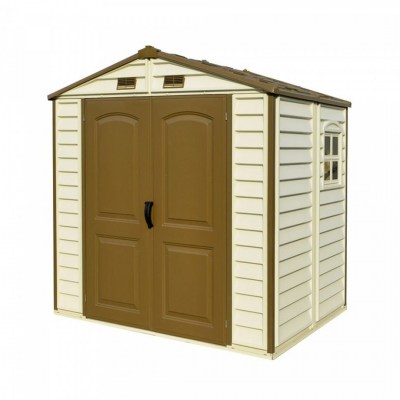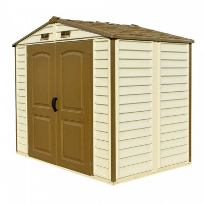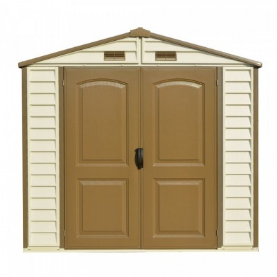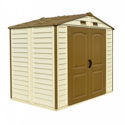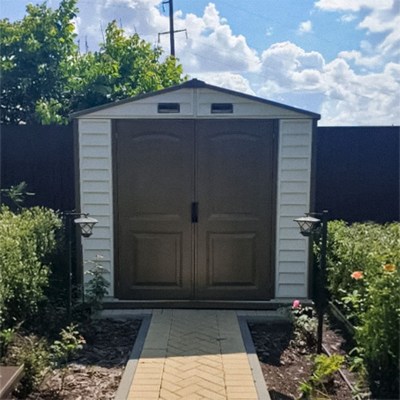 Пластиковый сарай Duramax Storeall – компактная быстровозводимая постройка для хранения садовой мебели, техники, инструментов. Внешне он выглядит стильно, отлично впишется на любой участок: бежевые стены с распашными коричневыми дверями и миниатюрным окошком.