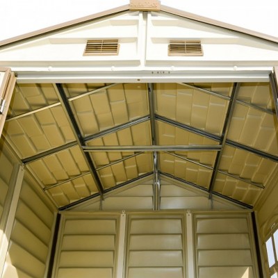 Сарай не ржавеет, не гниет и не нуждается в покраске и обслуживании, а также непроницаем для насекомых, поедающих древесину. Дизайн хозблока разработан для создания внутри достаточного уровня вентиляции и достаточной яркости света.