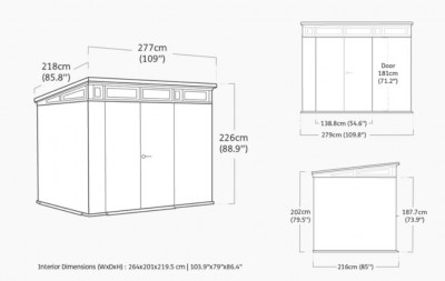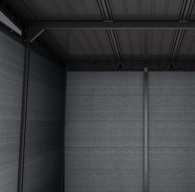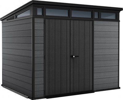 Сарай пластиковый Кортина 9х7 ( 279 х 216 см). Хозяйственный домик Cortina современен с любой точки зрения. Односкатная крыша, встроенные с трех сторон кровельные фонари и простые двустворчатые двери подчеркивают его оригинальный современный характер. Двухслойные стены изготовлены из очень прочного инновационного композитного материала "EvotechTM". Фактура поверхности поразительно отражает натуральный древесный рисунок. Этот необычайно прочный домик для инструментов устойчив к погодным условиям и ультрафиолетовым лучам и не нуждается в уходе - он не ржавеет, не гниет и не шелушится. Домик легко содержать в чистоте.