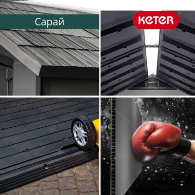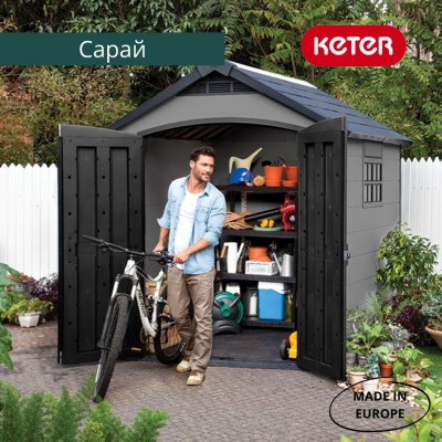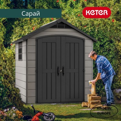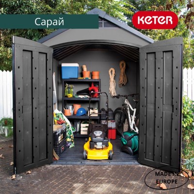 Сарай Премьер 757 (Premiere Shed 757), серый. Выполнен из прочного полипропилена DUOTECH™ (не гниет, не ржавеет, не промокает, устойчив к перепадам температур, можно пилить или сверлить). Стилизован под дерево. Крыша дополнительна укреплена стальной конструкцией и выдерживает вес до 200 кг/м2. Панели можно окрасить водоэмульсионной краской. Двери двойные прочные. Она в индустриальном стиле. Пол крепкий, подходит для хранения хох.техники. Окно (конек) крыши во всю длину. Продуманная систем вентиляции. Поставляется изделие в разобранном виде. У станавливается на ровную, подготовленную поверхность.