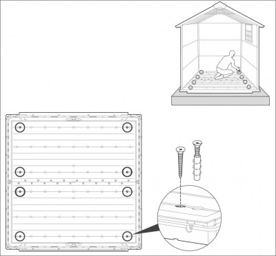 Сборка дома обязательна с использованием соответствующих шурупов с постоянным креплением к земле в специально отведенных местах на полу дома (шурупы в комплект не входят). Тип и размер крепежных винтов или анкеров зависят от модели дома, типа и типа подготовленного основания, например, бетонного (бетонная стяжка, брусчатка), деревянного (ОСБ-плита, деревянные плиты) и т. д.