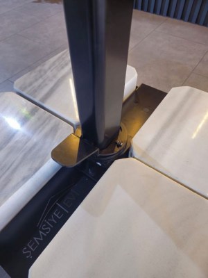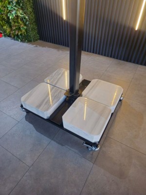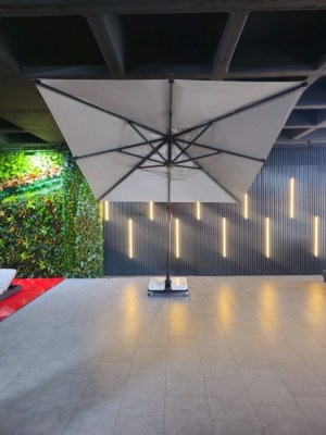 • Боковая опора сечением 70х70 мм и толщиной стенки 2.5 мм выполнена из окрашенного алюминия со специальной термообработкой, которая повышает прочность и коррозионную стойкость зонта. Высота опоры - 3100 мм.