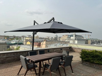 Зонт легко открывается и закрывается при помощи рукоятки, а сам механизм блокируется для безопасности. Купол может подниматься под углом до 60°. Для того, чтобы закрыть или открыть зонт Banana Plus, не нужно двигать мебель под ним.